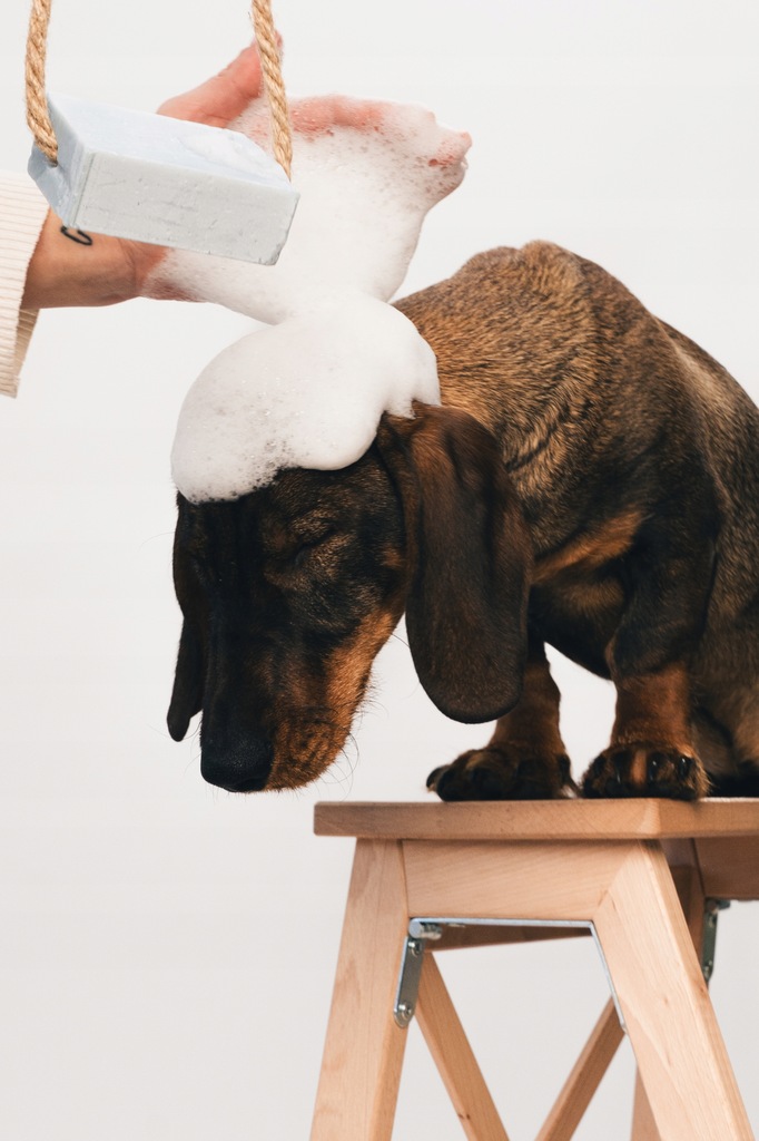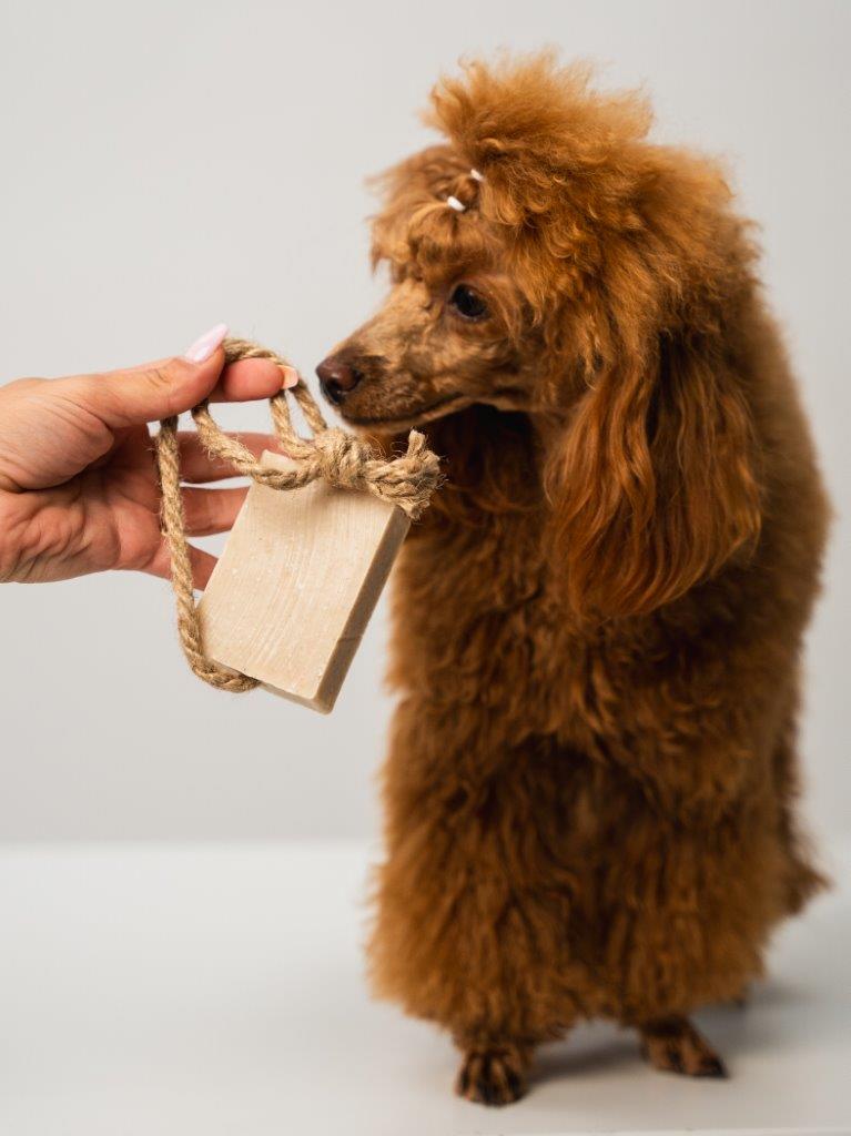 Łatwa kąpiel dla Twojego pupila: Zwilż mydło, spień i wmasuj w sierść. Po kilku minutach dokładnie spłucz, omijając oczy, nos i pyszczek. Gotowe! Pamiętaj, aby po każdym użyciu odłożyć mydło do wyschnięcia np. na ażurową mydelniczkę lub zawiesić za pomocą jutowego sznurka.