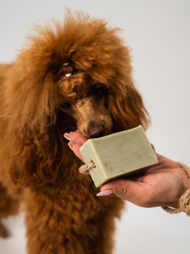 Ręcznie robione mydło z naturalnych i wysokiej jakości olejów roślinnych, w tym  laurowego i olejku eterycznego lawendowego, zapewnia Twojemu psu delikatne oczyszczanie i zdrową, odżywioną skórę. Idealne do częstej pielęgnacji. Dla wygody stosowania zawieszone na jutowym sznurku.